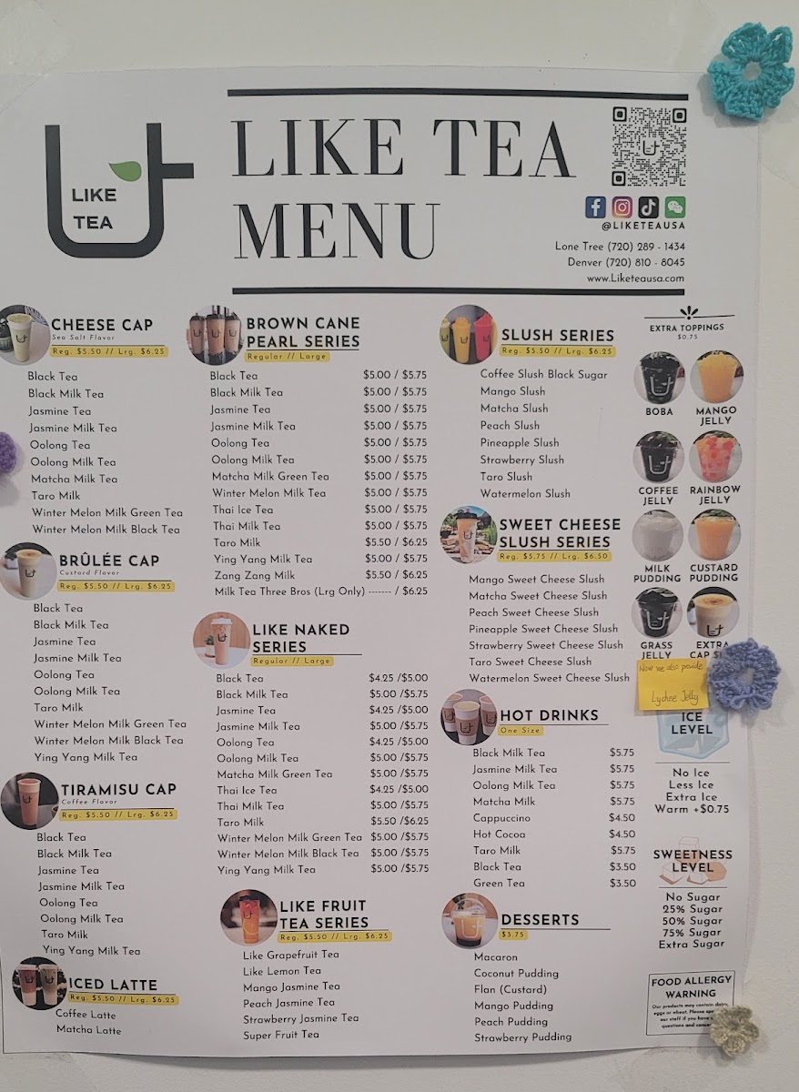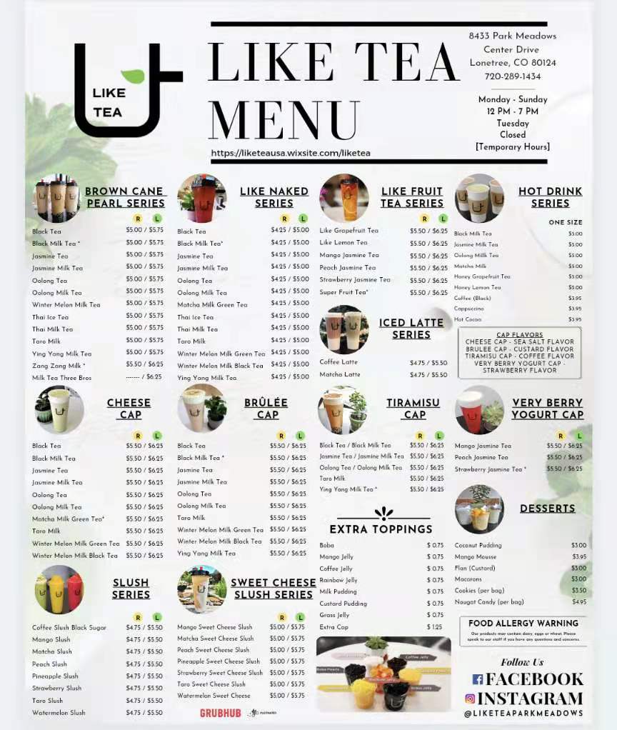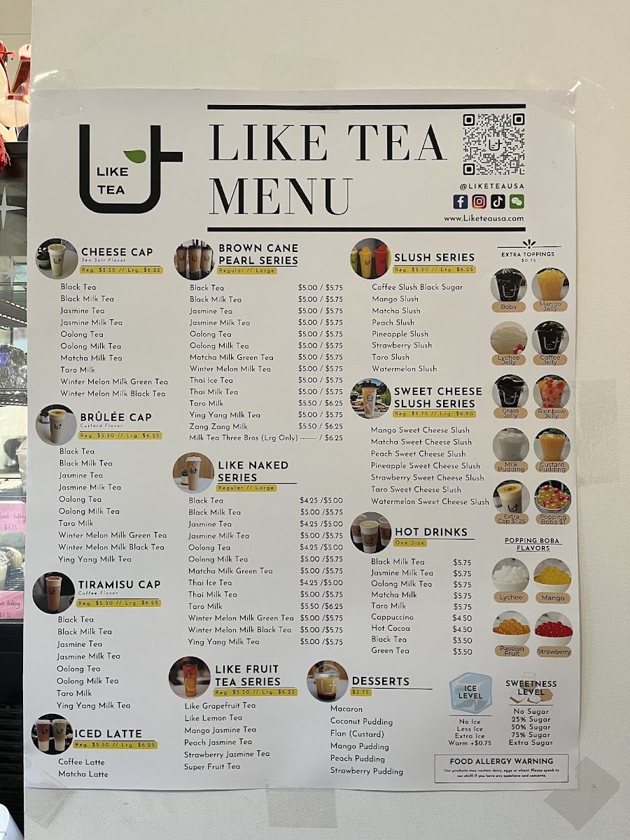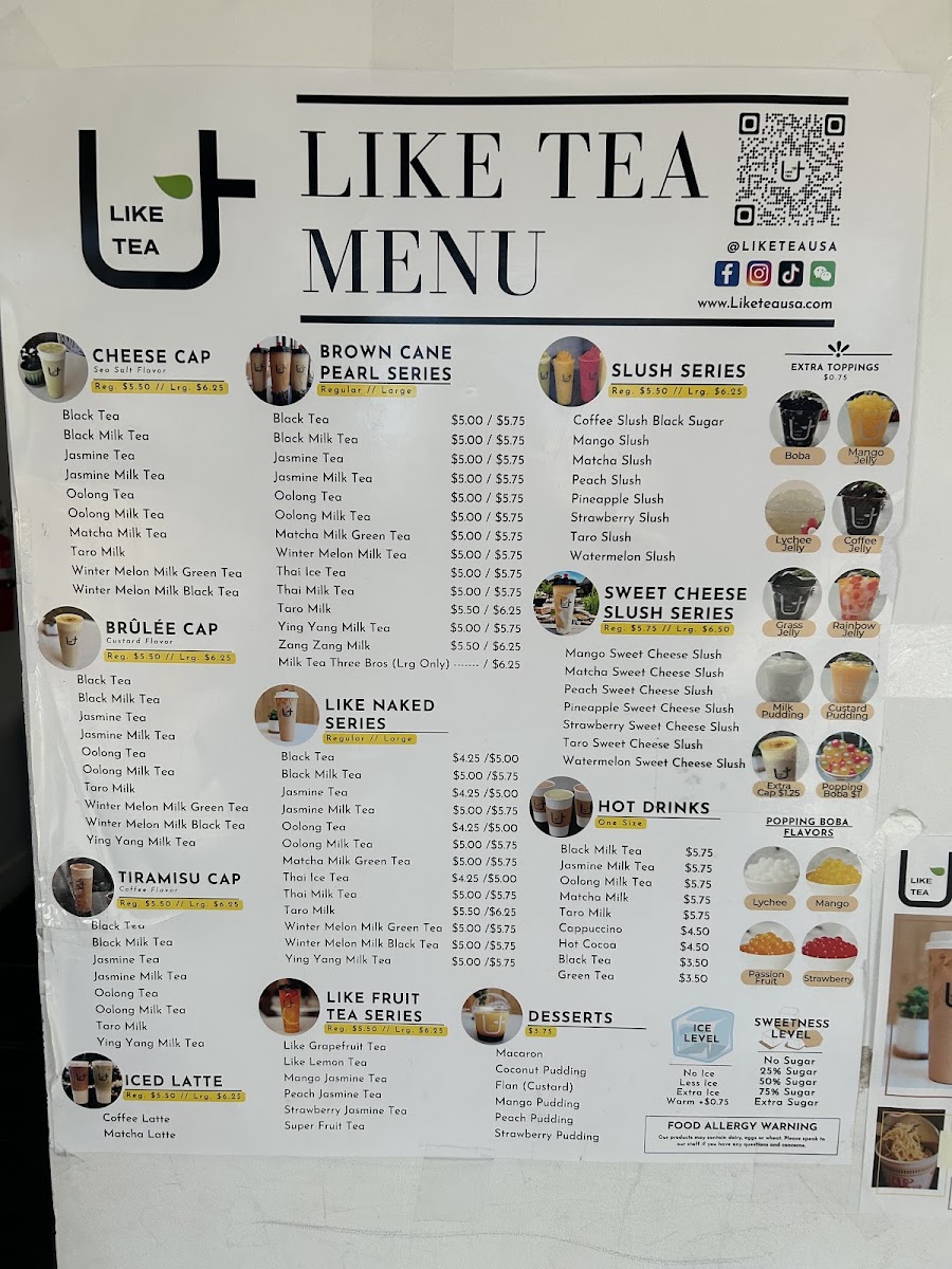 The menu at Like Tea offers a delightful selection of beverages and snacks that cater to a variety of tastes. For those craving something refreshing, the Slush options like Mango Slush and Taro Slush provide a cool, fruity experience. Dessert lovers can indulge in classics such as Tiramisu, Macarons, and the unique Hongkong Original Egg Waffle. The Fruit Tea Series offers an exciting variety, including Passion Jasmine Tea and Super Fruit Tea, perfect for a light, flavorful pick-me-up. For coffee enthusiasts, there are several options under the Latte category, like Matcha Latte and Coconut Coffee Latte, each delivering a creamy, satisfying taste. The Specialty Series takes things up a notch with indulgent drinks such as Super Strawberry Milk and Mango Fresh Milk With Matcha Cream (Large), offering a blend of fruit and creamy textures. If you’re in the mood for something a bit more decadent, the Cheese Cap Series presents drinks like Jasmine Tea Cheese Cap and Taro Milk Cheese Cap, with a savory cheese topping. Finally, the Classic Milk Tea Series features staples such as Black Milk Tea and Oolong Milk Tea, offering comforting, traditional flavors. With its wide range of choices, Like Tea’s menu ensures that there’s something for everyone, whether you’re looking for a sweet treat, a refreshing drink, or a bold latte.