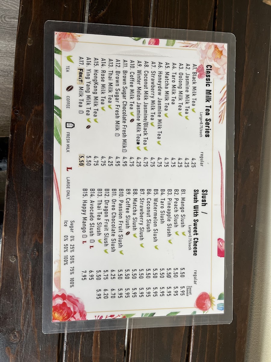 Jasmine Tea with evaporated milk.you can change other milk if you want.don’t include boba yet,Optional for the topping s,you can chooses regular or large size, sweetness from no sugar to extra sweet, and ice customization.